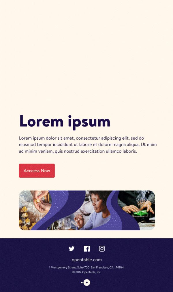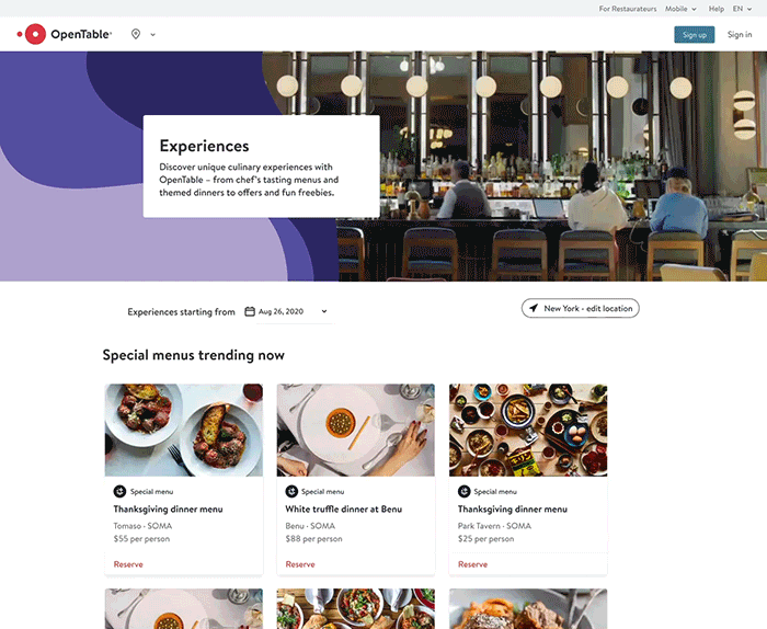 During the height of the Covid-19 crisis, OpenTable launched a new feature called Experiences. It’s not only a new revenue source for restaurants, but Experiences also allowed for safe indoor dining packages. This work was a collaboration with my Brand team, and I was primarily responsible for taking the design system onto social (paid and organic), email sends, and adding animation throughout the customer experience.